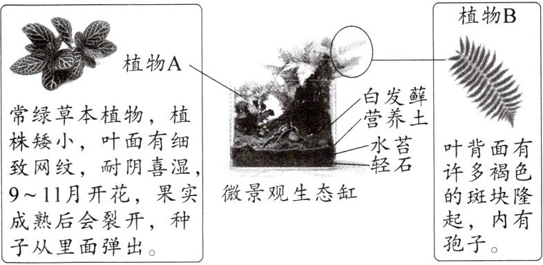 9. 跨学科实践植物栽培 学习了植物的类群后,小静制作了如图所示的微景观生态缸,制作过程为:①铺设约3~6mm的轻石层;②铺设水苔(可提高基质的透气性和保水性);③铺设营养土;④种植植物及装饰点缀。请你结合所学知识回答问题。