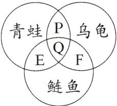 D 【解析】青蛙用肺呼吸,皮肤辅助呼吸;鲢鱼用鳃呼吸,故 E 不能表示用肺呼吸。青蛙体外受精,乌龟体内受精,故 P 不能表示体内受精。鲢鱼生活在水中,用鳍协调游泳;乌龟是爬行动物,没有鳍,故 F 不能表示用鳍游泳。青蛙、乌龟、鲢鱼都是脊椎动物,故 Q 可以表示有脊柱。