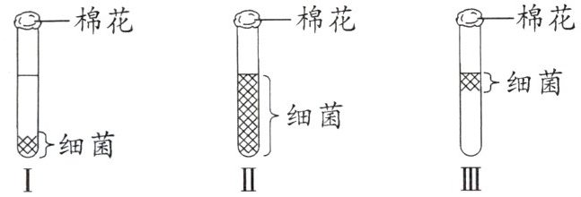 B 【解析】由图示分析可知:第Ⅰ种细菌处于试管底部,属于厌氧细菌;第Ⅱ种细菌与培养液相融合,属于兼性细菌;第Ⅲ种细菌处于培养液上部,与空气相通,属于好氧细菌。如果此时往三支试管中通入氧气,第Ⅰ种是厌氧细菌,其生长受到抑制;第Ⅱ种没有发生变化;第Ⅲ种是好氧细菌,繁殖速度加快。