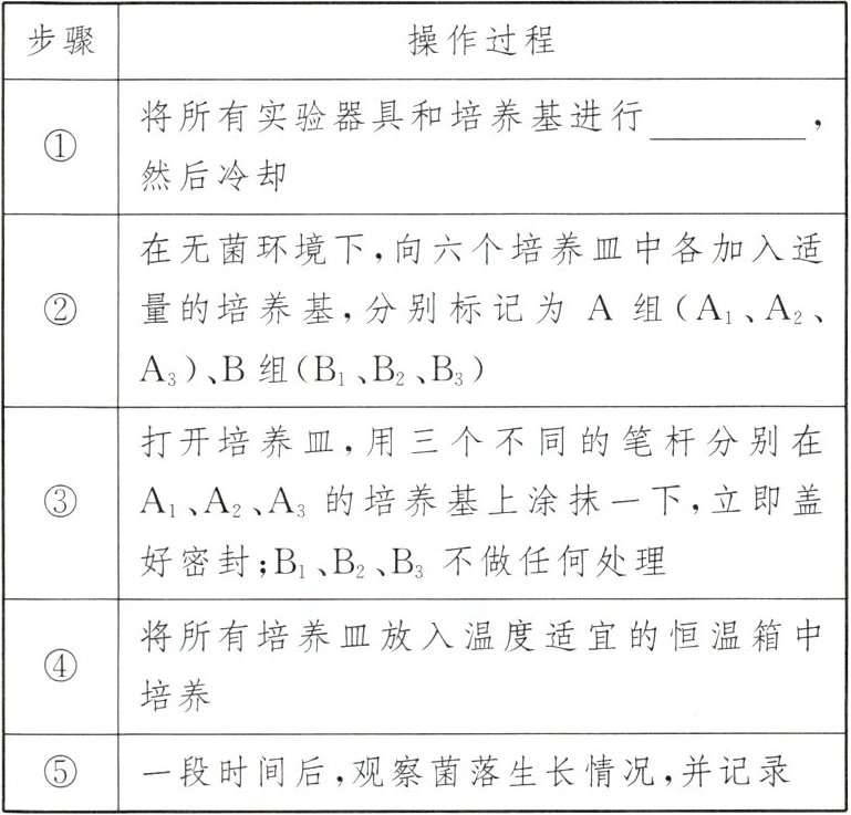 步骤。(5)实验中观察到的现象:A组培养基上均有许多大小不同的菌落,B组培养基上均无菌落。据此得出结论:
