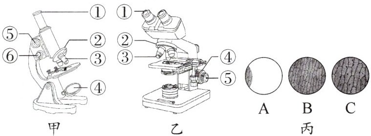 10. (成都期末)如图甲、乙分别为单目显微镜和双目显微镜结构示意图,图丙为用显微镜观察细胞时依次看到的几个视野。