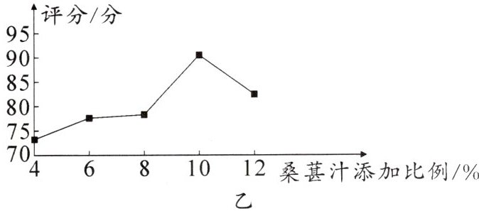 。(3)分析图乙中的数据可发现,随着桑葚汁添加比例的增大,酸奶评分呈
