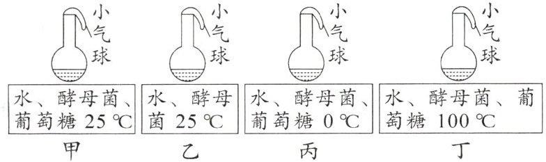 D 【解析】甲组中酵母菌处于适宜的温度条件下,可以将葡萄糖转化为酒精和二氧化碳,使小气球胀大。甲、丙、丁组仅温度不同,可以形成对照,用来验证温度对酵母菌发酵作用的影响。甲组和乙组的不同之处是甲组含有葡萄糖,而乙组没有,因此实验变量为有机物。丙组的小气球不会胀大是因为温度太低,酵母菌的发酵作用受到抑制,产生的二氧化碳少,而不是因为酵母菌死亡;丁组的小气球不会胀大是因为100℃时酵母菌已死亡。