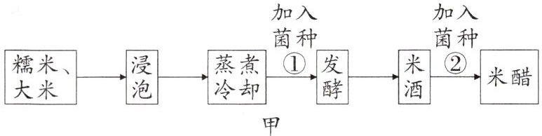 8. (南充中考)随着科技的进步,水稻产量不断提高,人们开始利用发酵技术生产米酒和米醋,丰富日常的饮食。如图甲是米酒、米醋的简易制作流程,请回答相关问题。