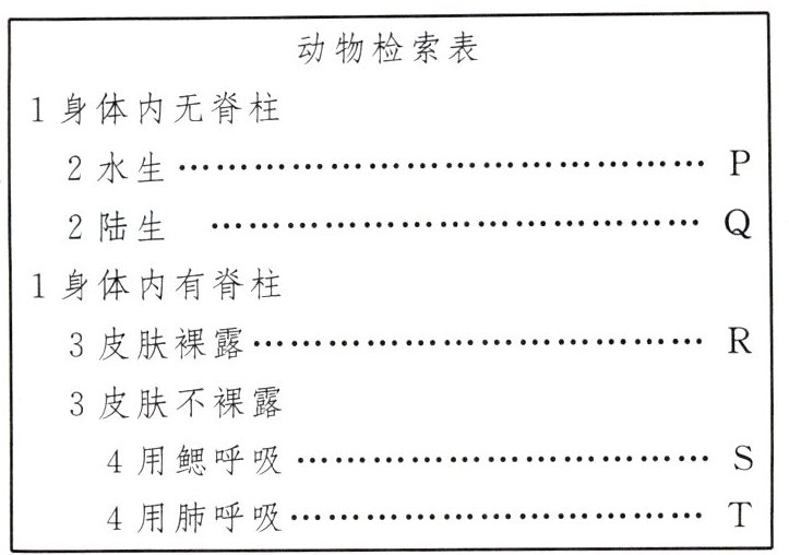 8. 新课标情境素材(潍坊中考)通过查阅检索表,可以确定生物的分类地位,判断不同生物之间的亲缘关系。如下表为动物检索表的一部分,P、Q、R、S、T表示动物类群,有关说法正确的是(