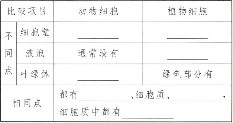 【易错提醒】区分动物细胞和植物细胞主要是看有无细胞壁和液泡,而不是叶绿体,因为植物非绿色部分的细胞中也没有叶绿体。