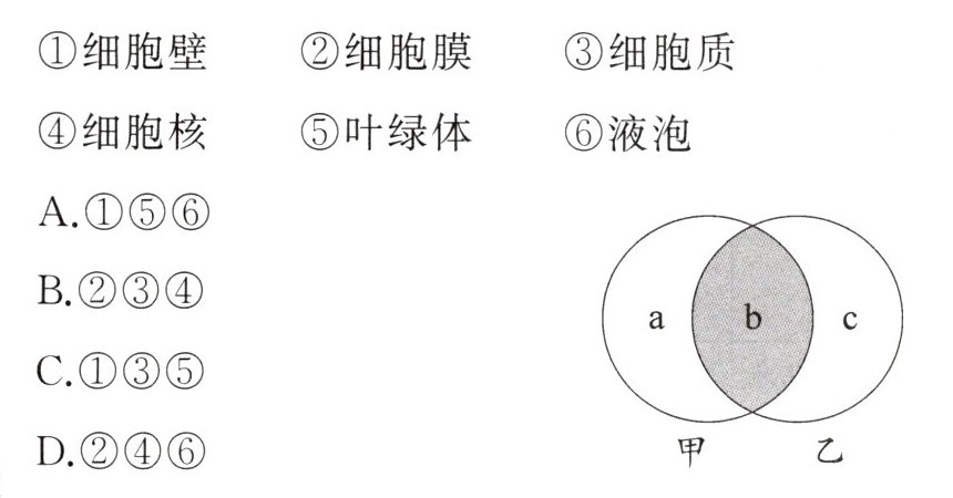 9. 科学思维 归纳 如图,甲、乙分别代表动物细胞和植物细胞,b 区代表它们的共同点,则 c 区含有的细胞结构是(