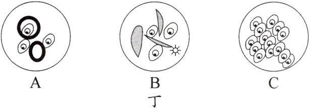 。(3) 用显微镜观察人的口腔上皮细胞临时装片时,A、B、C 三位同学看到的视野如图丁所示。