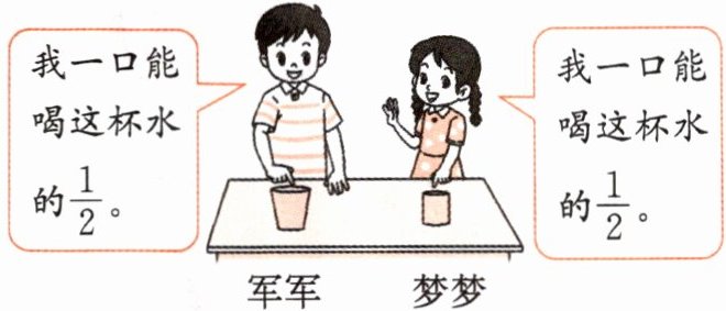 (2)因为军军的杯子比梦梦的杯子大,所以军军喝的那杯水的$\frac{1}{2}$比梦梦喝的那杯水的$\frac{1}{2}$多,即军军一口喝的水多。