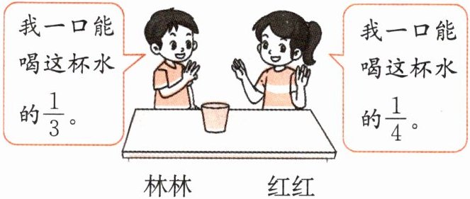 (1)因为喝同一杯水,且$\frac{1}{3}>\frac{1}{4}$,所以林林一口喝的水多。