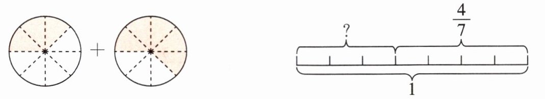 2. $\frac{3}{8}+\frac{5}{8}=1$(或$\frac{8}{8}$) $1-\frac{4}{7}=\frac{3}{7}$