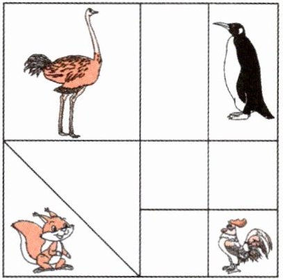 一、写出下列小动物所在的部分分别占大正方形的几分之一。(4 分)
