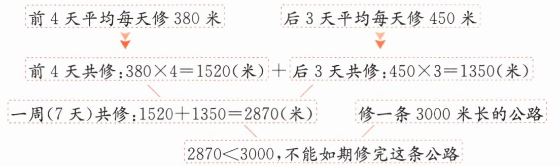 典型例题 修路工人修一条 3000 米长的公路,工期为一周(7 天)。前 4 天平均每天修 380 米,后 3 天平均每天修 450 米,能如期修完这条公路吗?