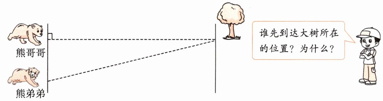 熊哥哥先到达大树所在的位置。因为速度相同,路程短的用时少,从直线外一点到这条直线的所有连线中垂直线段最短,所以熊哥哥先到达大树所在的位置。