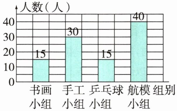 (2)直条最高的航模小组有40人,直条第二高的手工小组有30人,这两个小组的人数加在一起最多,共有$40 + 30 = 70$(人)。