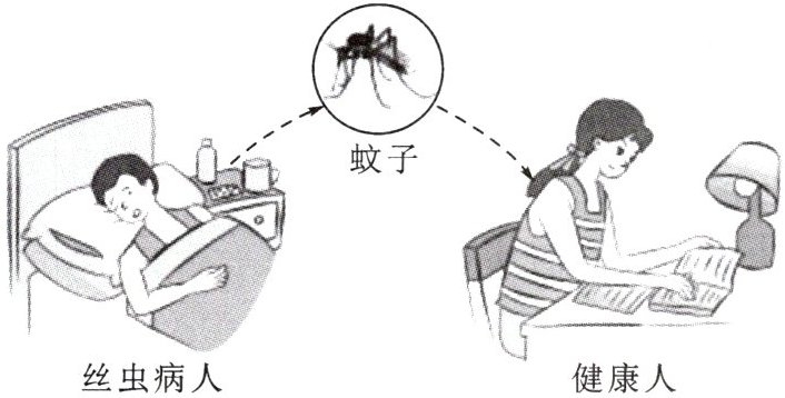 9. 如图是一只蚊子在吸食了丝虫病人(血液中含有丝虫的幼虫——微丝蚴)后,又吸食了健康人,她也患上了丝虫病。请据图回答下列问题。