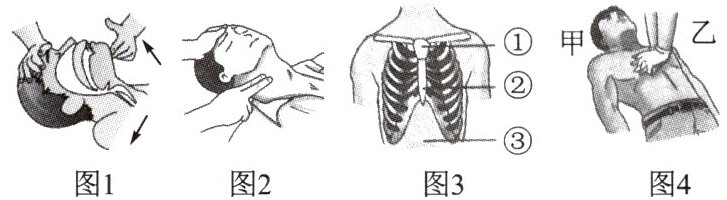 的情况,判断有无心跳。(4) 图 3 中胸外心脏按压的正确部位是