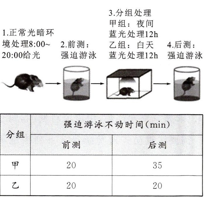 (4) 查阅资料时发现,光也会影响睡眠、情绪等非成像视觉功能,夜间光的输入会增加患抑郁症的风险。兴趣小组模拟手机、电脑等蓝光模式,按图示流程探究夜间蓝光诱发小鼠的抑郁行为,得到表中结果(“强迫游泳”作为反映抑郁程度的指标,不动时间越长表示抑郁程度越重)。