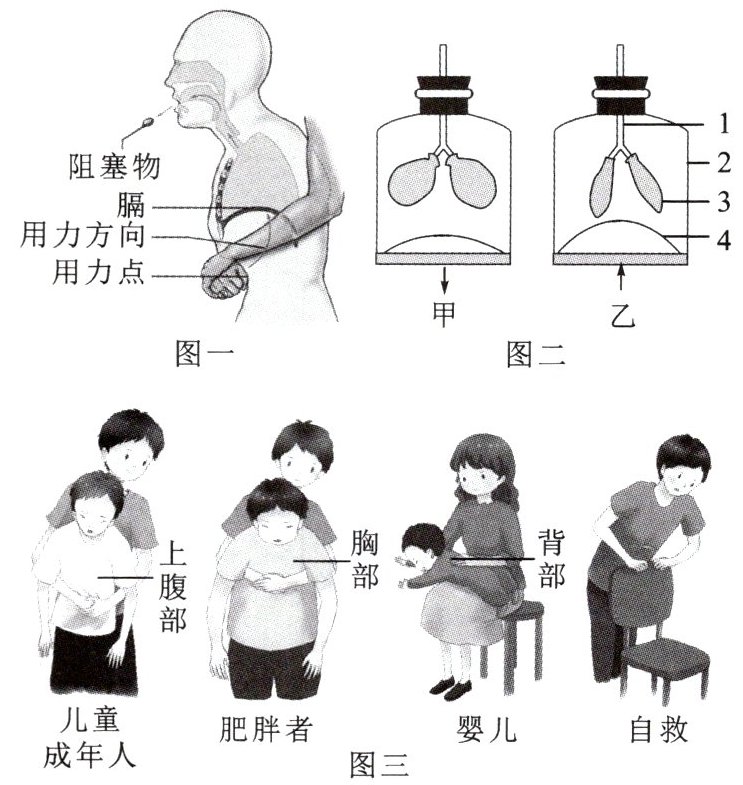 (填“甲”或“乙”)。(4) 万一自己或身边人发生异物误人气管的意外,可按照图三所示的方法施救,为避免此种意外,我们更要养成良好的生活习惯,如