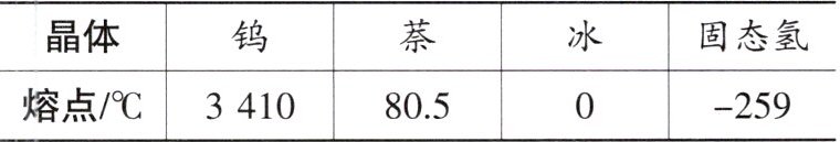 6. 跨学科·化学 在标准大气压下,钨、萘、冰、固态氢四种晶体的熔点如下表: