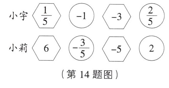 14.应用意识在一次班会上,主持人小宇和小莉进行小游戏.游戏规则:每人每次抽4张卡片,如果抽到的形状为“O'',那么加上卡片上的数字;如果抽到的形状为,那么减去卡片上的数字.最终计算结果小的为大家表演节目.小宇和小莉抽取的卡片如图所示,本次游戏结束后由谁给大家表演节目?