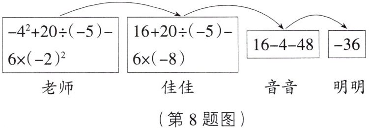 8. 老师设计了一个接力游戏,用合作的方式完成有理数运算,规则是每人只能看到前一人给的式子,并进行一步计算,再将结果传递给下一人,过程如图所示。接力中,计算错误的学生是(