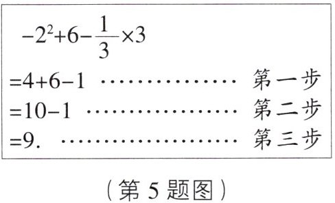 5. 如图所示的是嘉淇计算“$-2^{2} + 6 - \dfrac{1}{3} × 3$”的过程,开始出错的步骤是(