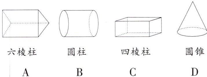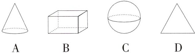 D [解析]选项对应的几何图形分别是圆锥、长方体、球、三角形,三角形是平面图形. 方法归纳 判断一个图形是立体图形还是平面图形的方法:平面图形的各部分都在同一平面内,立体图形的各部分都不在同一平面内.