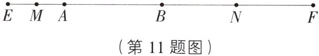 11. 如图,已知$A$,$B是线段EF$上的两点,$EA:AB:BF = 1:2:3$,$M$,$N分别为线段EA$,$BF$的中点,且$MN = 8\ cm$,求$EF$的长。