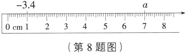 8. 将一把刻度尺按如图所示的方式放在数轴上(数轴的单位长度是 1 cm),刻度尺上的“1 cm”和“7 cm”分别对应数轴上的 -3.4 和 $ a $,则 $ a $ 的值为(
