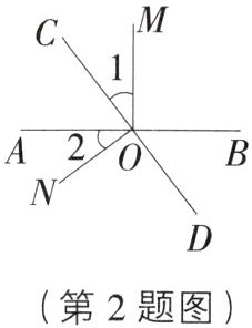 2. 如图,直线 AB,CD 相交于点 O,过点 O 作两条射线 OM,ON,且∠AOM = ∠CON = 90°。