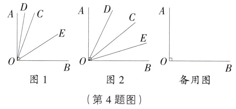4. 已知∠AOB = 90°,作射线 OC,再分别作∠AOC 和∠BOC 的平分线 OD,OE。