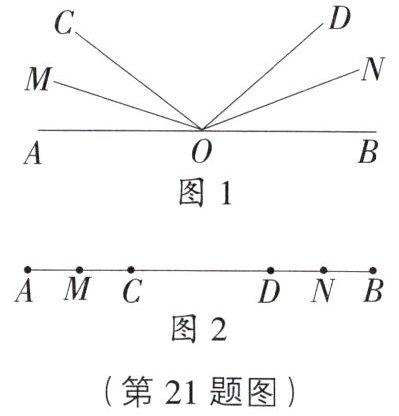 21. (10分)一题多解如图1,点O在直线AB上,过点O在直线同侧作两条射线OC,OD;OM,ON分别是$∠AOC$,$∠BOD$的平分线。
