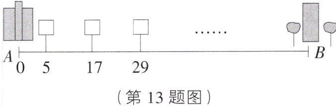 13. 应用意识 如图,A,B两地之间有一条东西走向的道路.在A地的东边5 km处设置第一个广告牌,之后每往东12 km就设置一个广告牌.一辆汽车从A地出发,沿此道路向东行驶.当经过第n个广告牌时,此车所行驶的路程为