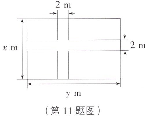 11. 如图,某小区计划在相邻两边长分别为x m,y m的长方形场地上,修建两条宽为2 m的雨道,其余部分种草,则草地的占地面积为