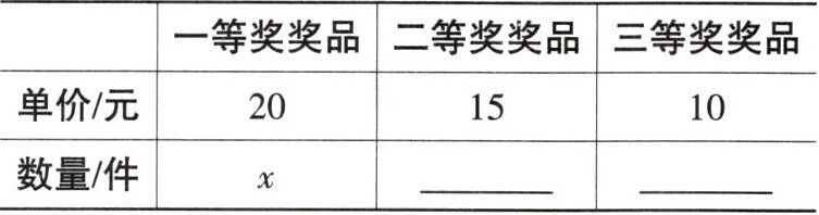 (2)购买这60件奖品所需的总费用为$[20x+15(2x+10)+10[60-x-(2x+10)]]$元.