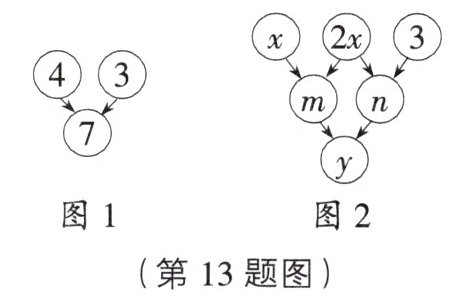 13. 约定:上方相邻两数之和等于这两数下方箭头共同指向的数,如图1所示,即 $ 4 + 3 = 7 $.