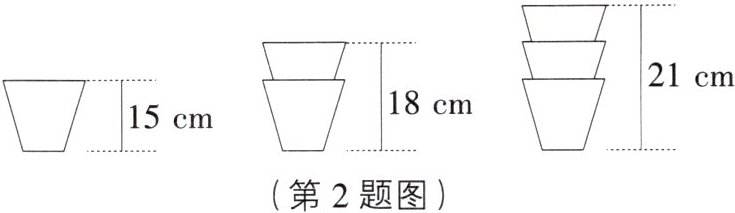 2. 某种杯子的高度是 $15$ cm,两个以及三个这样的杯子叠放时高度如图。