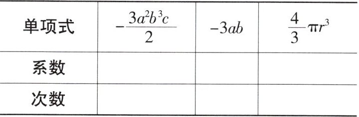 单项式 $-\frac{3a^{2}b^{3}c}{2}$ $-3ab$ $\frac{4}{3}πr^{3}$