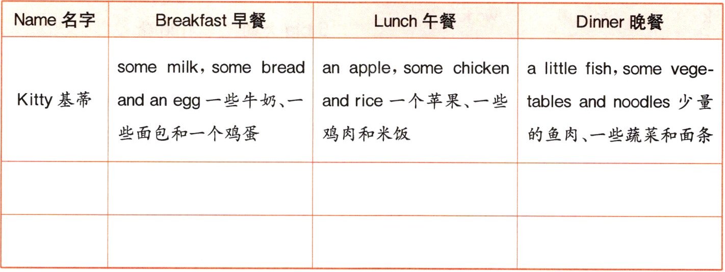 【参考词汇】breakfast,lunch,dinner,egg,vegetable,fruit,noodle,milk,bread,fish,chicken