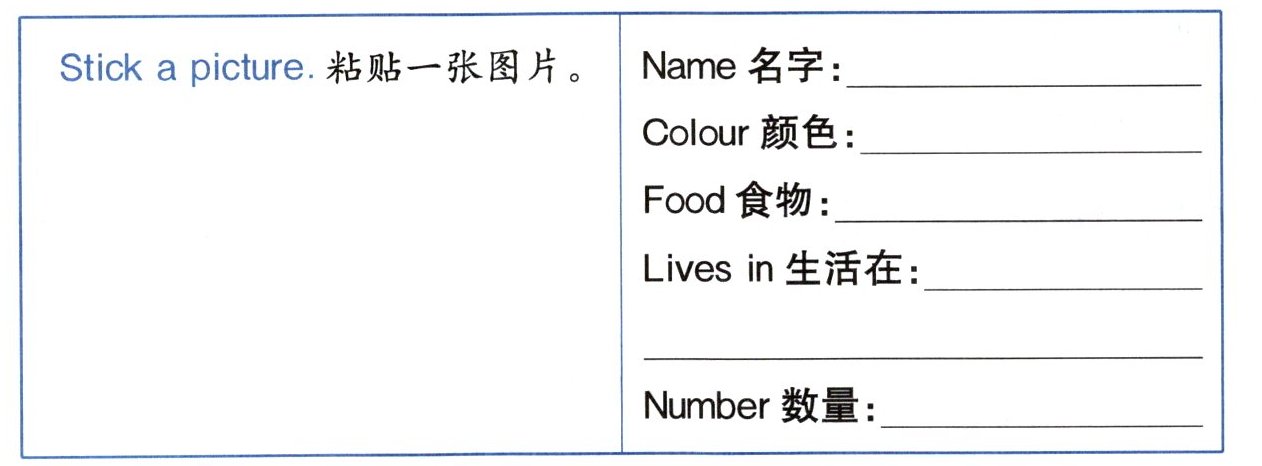 ①Find out more about an animal in danger. Stick a picture and write. 找出更多关于面临危险的一种动物的信息。粘贴一张图片并写一写。