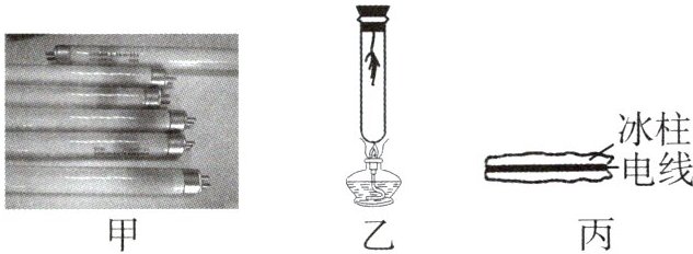 5. 小明看到家中日光灯管的两端各有一圈黑色,如图甲所示,从外面擦怎么也擦不掉,他觉得很奇怪,于是向爸爸请教。爸爸让他在一支长试管内装入少量的碘粉,塞上底部悬挂了少量棉线的橡皮塞,用酒精灯慢慢加热,如图乙所示。
