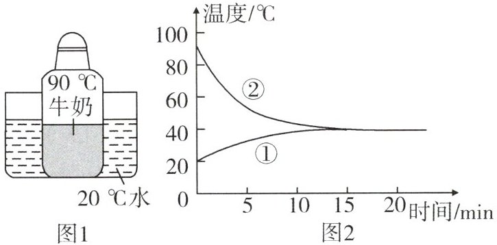 17. (2024·济南济阳四堤中学质检)如图1所示,小明将装有牛奶的奶瓶放入温度等于室温的水中,水温为$20^{\circ}C$,牛奶的温度为$90^{\circ}C$,同时,他还利用温度计和秒表测出温度的变化情况,并作出了水和牛奶的温度随时间变化的关系曲线,如图2所示。大约经过$15min$,牛奶和水的温度刚好达到一致。