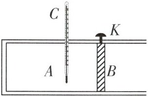 16. 科学实践 如图所示,在气缸$A$中密封有压缩的气体,$B是一种被销钉K$锁住的活塞,$C$是一个温度计。若忽略活塞与气缸壁间的摩擦,当把销钉拔出后: