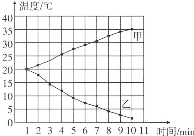 5. (2024·信阳浉河中外合作学校质检)甲、乙液体分别置于两个不同的恒温封闭环境中,质量保持不变,测得甲、乙液体的温度随时间变化如图。下列说法正确的是(