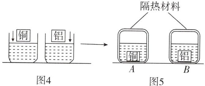 ② 再将铜块和铝块分别放入盛有质量相等、温度相同的水的 A、B 两容器中,并将容器用隔热材料密封,如图 5 所示;
