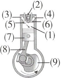 1. 结构:如图所示,(1)气缸,(2)___________,(3)进气道,(4)___________,(5)进气阀,(6)___________,(7)___________,(8)连杆,(9)曲轴.
