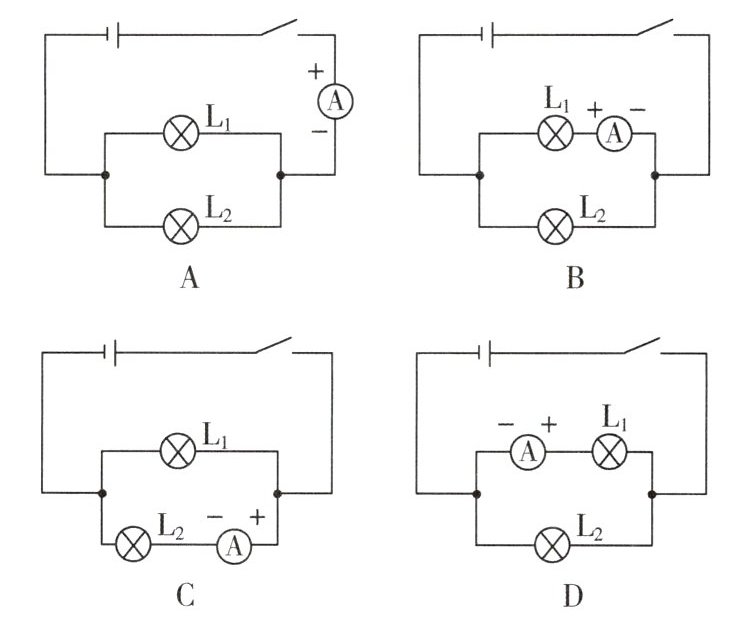 4. 科学态度与责任 下列图中能直接测量通过灯$\mathrm{L}_{1}$的电流的电路是(