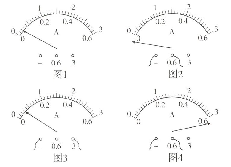 9. 科学思维 甲、乙、丙、丁四名同学在做“用电流表测电流”的实验时,甲在连接电路前发现电流表指针偏转情况如图1所示;乙、丙、丁闭合开关前,他们的电流表指针均指在零刻度线处,当闭合开关试触时,发现电流表指针摆动分别出现了如图2、3、4所示的三种情况.