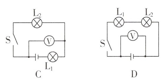 3. 在如图所示的电路中,闭合开关$\mathrm{S}$,能用电压表测量$\mathrm{L}_{2}$两端电压的是(
